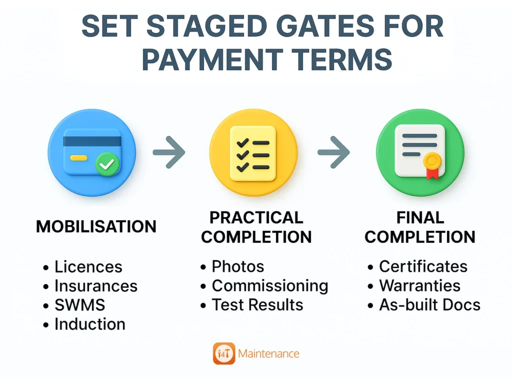 Paying before you receive the required documents is asking for pain. Set staged gates: mobilisation (licences, insurances, SWMS, induction) → practical completion (photos, commissioning, test results) → final completion (certificates, warranties, as-built docs).