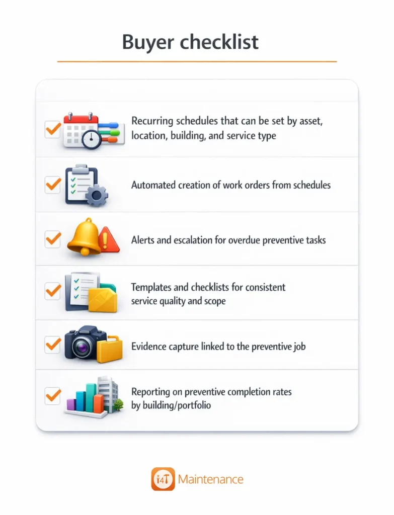 And if you want the best cmms for preventive maintenance management, make sure preventive scheduling is operationally effortless: recurring work orders, reminders, checklists, evidence, and reporting that shows you’re on top of it.