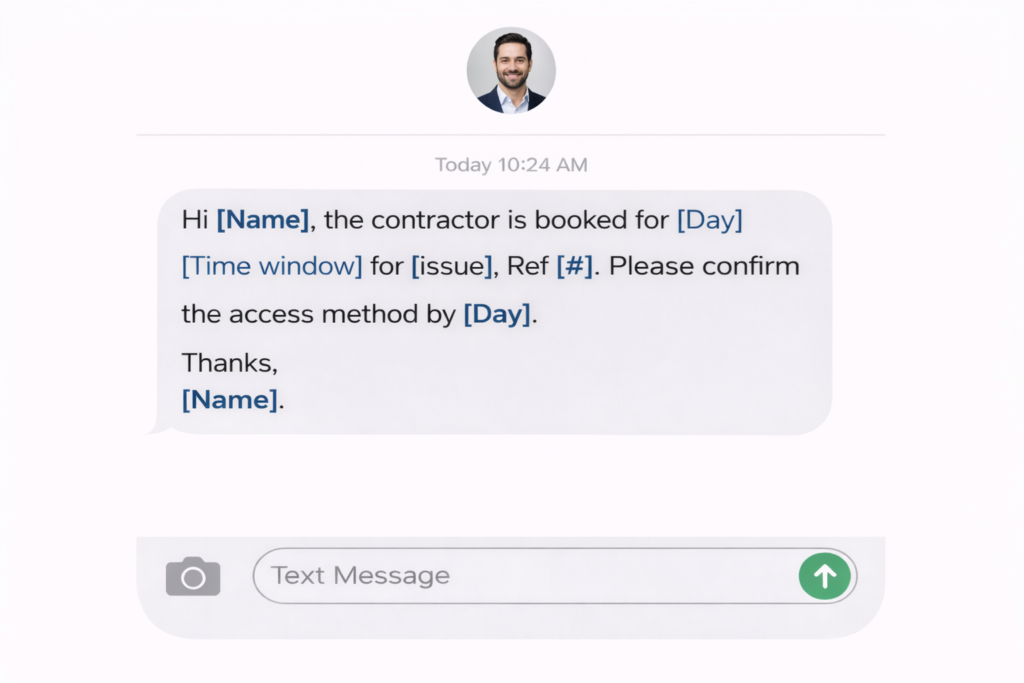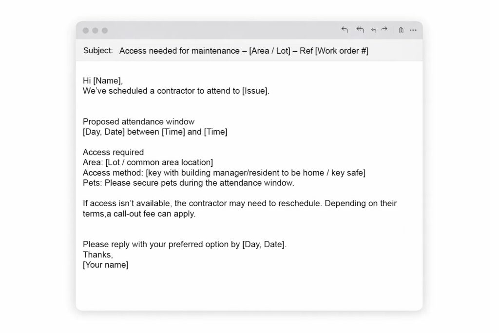 Access requests work best when they’re specific. If you include the date, time window, access method, and what happens if no one can provide access, you’ll usually get a quicker response.