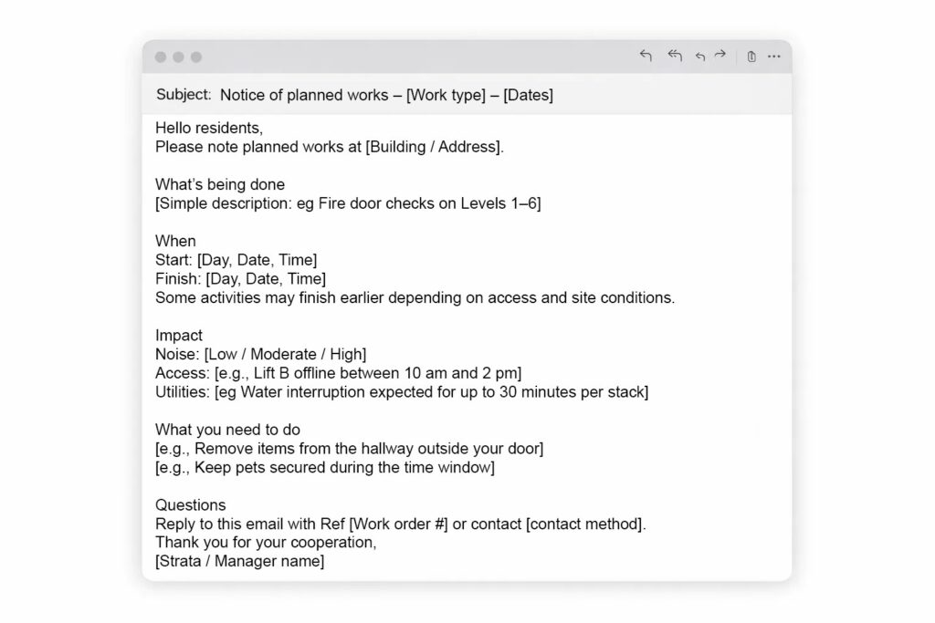 It’s also worth keeping privacy in mind. Avoid sharing personal details beyond what’s needed to arrange access, and don’t identify who lodged the original request in a building-wide message. OAIC guidance covers how personal information should be used or disclosed.
