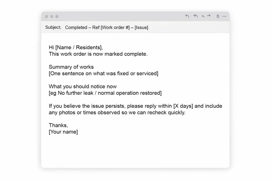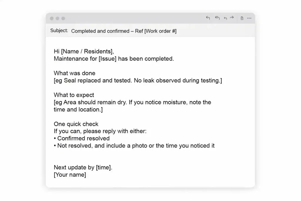 Close-out messages are a great chance to reduce repeat emails. Instead of just saying completed, explain what was done, what residents should notice now, and what to do if the issue pops up again.