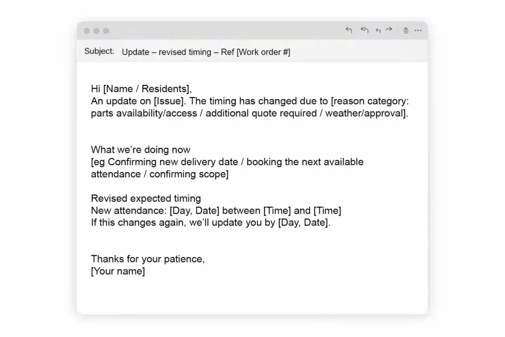 Share the reason category (parts, access, approvals) and a revised date or time window straight away.