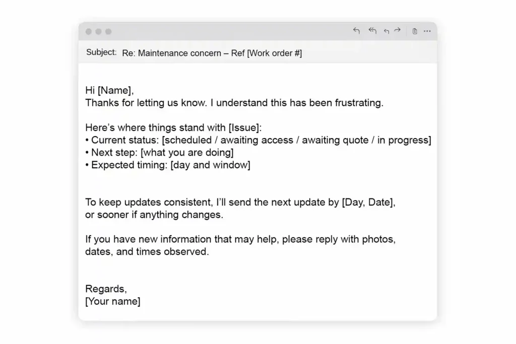 If you want fewer follow-ups for addressing issues regarding regular inspections or regular maintenance, aim to include the same key details every time. Keep it short, factual, and easy to scan so residents know what to expect.