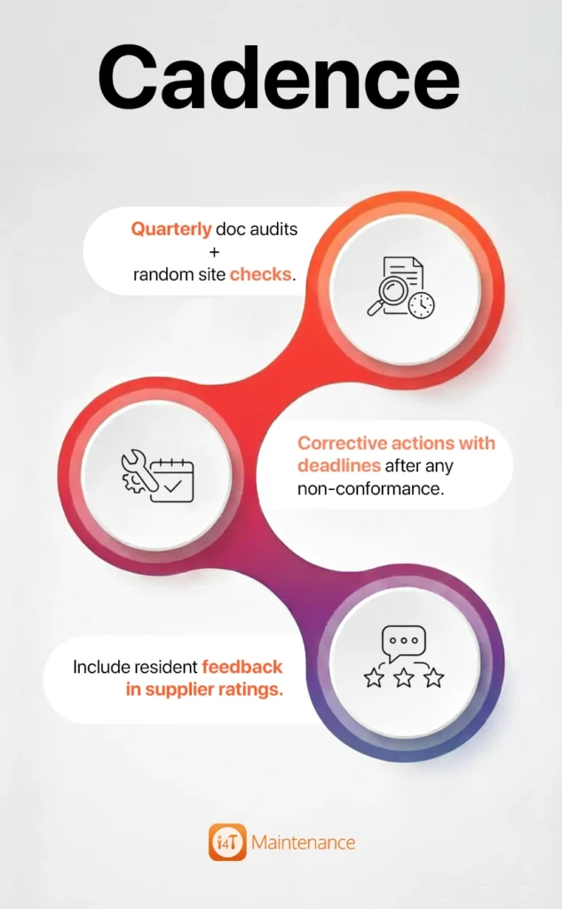 Numbers to watch: on-time document renewals (a leading indicator of attention to detail), emergency response time, first-time-fix rate, callback rate, SWMS adequacy (were controls job- and site-specific?) and incident/near-miss frequency. Share these metrics openly with suppliers so expectations are transparent. Schedule quarterly document audits and random site checks; after any non-conformance, issue corrective actions with deadlines. Fold resident and committee feedback into the rating so the score reflects safety and service.