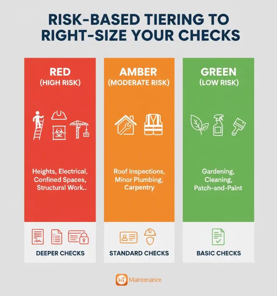 - Green (low risk): gardening, cleaning, minor patch-and-paint in non-hazardous areas. Expect licences (where applicable), insurance and site rules acknowledgment.